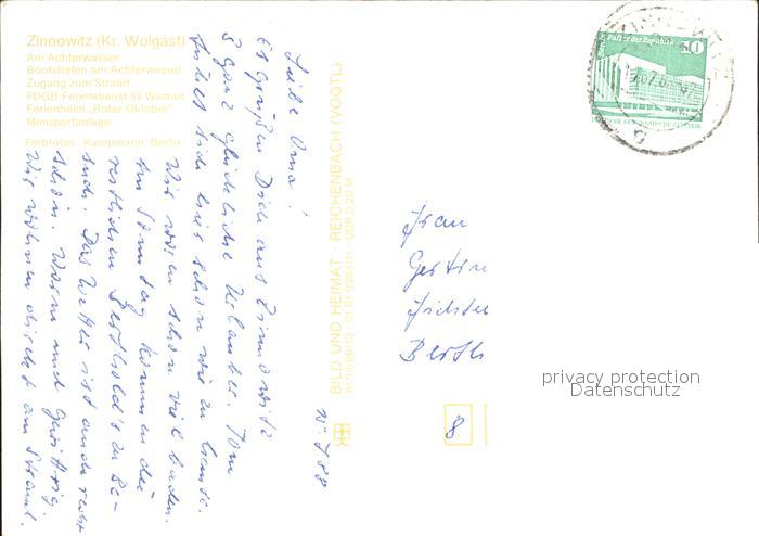 72336076 alte Postkarte Zinnowitz Ostseebad Achterwasser Bootshafen Strand FDGB Feriendienst IG Wismut Ferienheim Roter Oktober Minisportanlage postalisch gelaufen Erhaltung siehe scans KatCode: 11110013059107