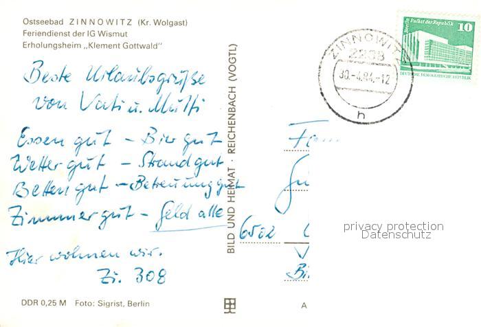 73085361 alte Postkarte Zinnowitz Ostseebad Erholungsheim Klement Gottwald postalisch gelaufen Erhaltung siehe scans [FriedD77] KatCode: 11110013059107