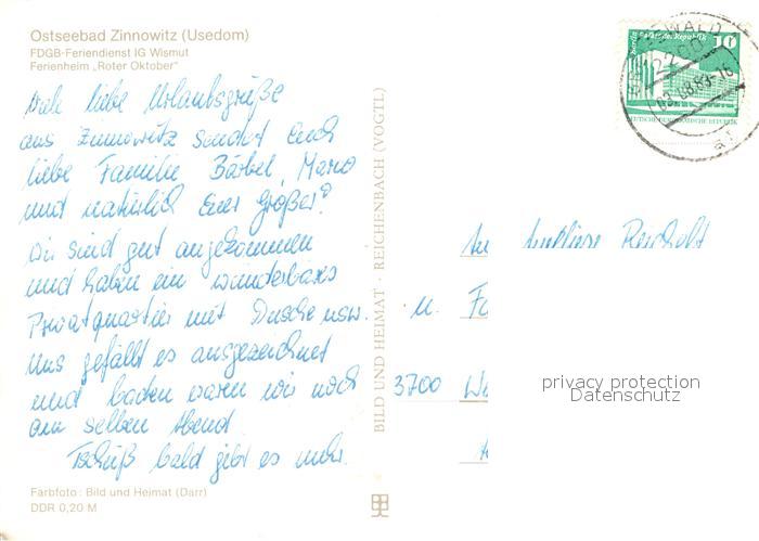73634373 alte Postkarte Zinnowitz Ostseebad FDGB Feriendienst IG Wismut Ferienheim Roter Oktober Strand postalisch gelaufen Erhaltung siehe scans [FriedD77] KatCode: 11110013059107