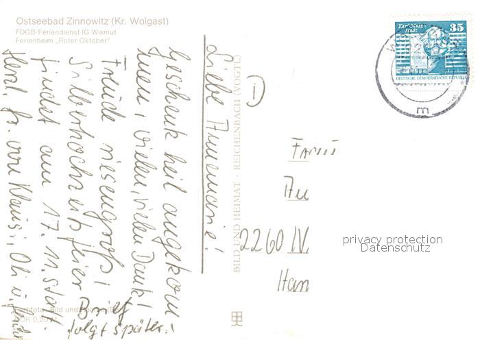 73152662 alte Postkarte Zinnowitz Ostseebad FDGB Feriendienst IG Wismut Ferienheim Roter Oktober Strand postalisch gelaufen Erhaltung siehe scans [FriedD77] KatCode: 11110013059107