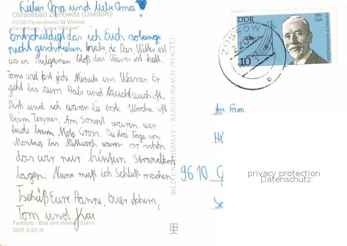 72673222 alte Postkarte Zinnowitz Ostseebad FDGB Ferienheim Roter Oktober postalisch gelaufen Erhaltung siehe scans [WerneD78] KatCode: 11110013059107