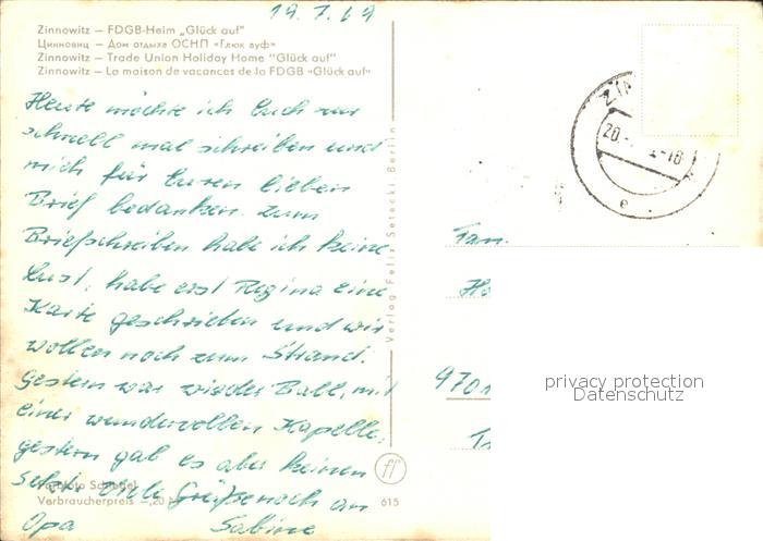 72383103 alte Postkarte Zinnowitz Ostseebad FDGB-Heim Glueck auf postalisch gelaufen Erhaltung siehe scans KatCode: 11110013059107