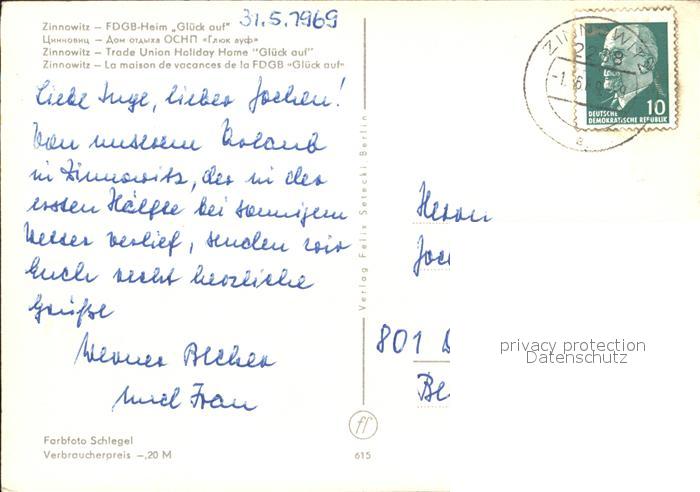 72370732 alte Postkarte Zinnowitz Ostseebad FDGB Heim Glueck auf postalisch gelaufen Erhaltung siehe scans KatCode: 11110013059107