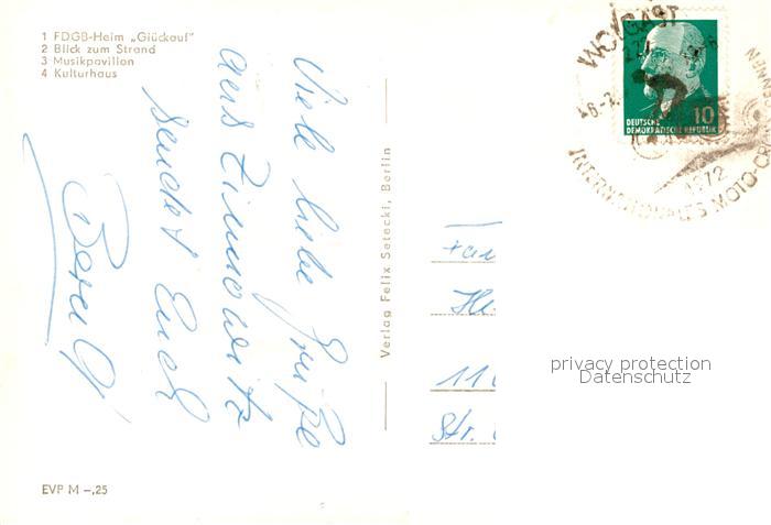 72963017 alte Postkarte Zinnowitz Ostseebad FDGB-Heim Glueckauf Strand Musikpavillon Kulturhaus postalisch gelaufen Erhaltung siehe scans [LiesaD40] KatCode: 11110013059107