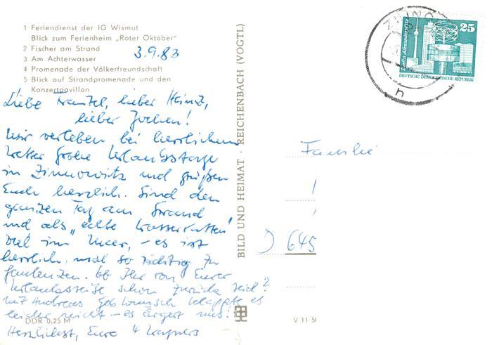 73888197 alte Postkarte Zinnowitz Ostseebad Feriendienst der IG Wismut Ferienheim Roter Oktober Fischer am Strand Achterwasser Promenade der Voelkerfreundschaft Strandpromenade Konzertpavillon postalisch gelaufen Erhaltung siehe scans [FriedD77] KatCode: 11110013059107