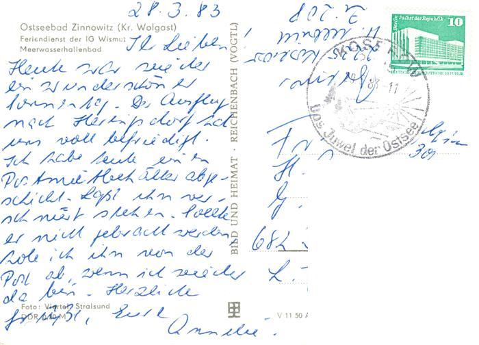 73896199 alte Postkarte Zinnowitz Ostseebad Feriendienst der IG Wismut Meerwasserhallenbad postalisch gelaufen Erhaltung siehe scans [WerneD78] KatCode: 11110013059107