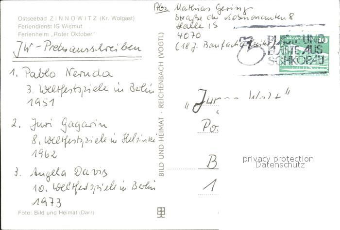 72277398 alte Postkarte Zinnowitz Ostseebad Feriendienst IG Wismut Ferienheim Roter Oktober postalisch gelaufen Erhaltung siehe scans KatCode: 11110013059107