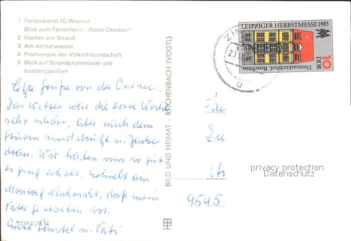72332102 alte Postkarte Zinnowitz Ostseebad Feriendienst IG Wismut Ferienheim Roter Oktober Strand Fischer Achterwasser Promenade Konzertpavillon postalisch gelaufen Erhaltung siehe scans KatCode: 11110013059107