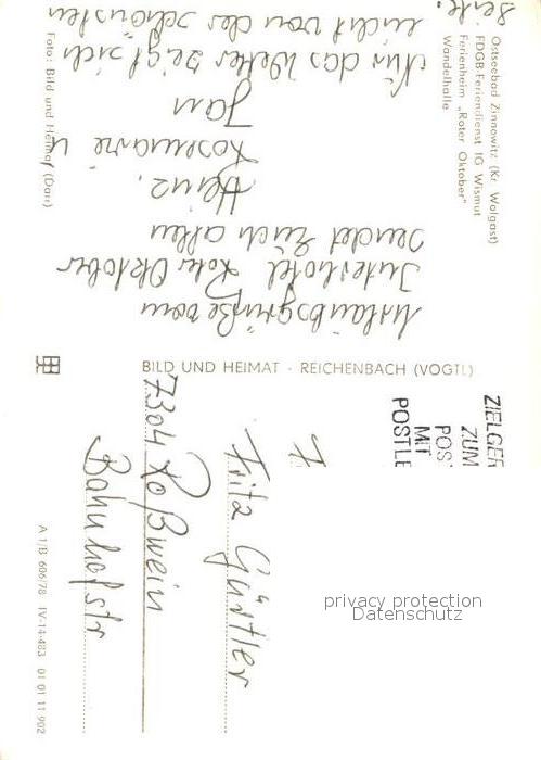 73279607 alte Postkarte Zinnowitz Ostseebad Ferienheim Roter Oktober Wandelhalle postalisch gelaufen Erhaltung siehe scans [NatalD47] KatCode: 11110013059107