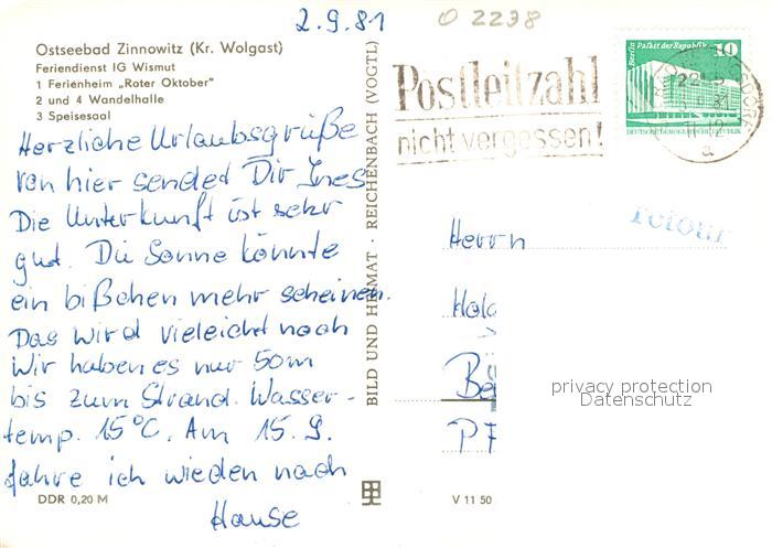 72941257 alte Postkarte Zinnowitz Ostseebad Ferienheim Roter Oktober Wandelhalle Speisesaal postalisch gelaufen Erhaltung siehe scans [NatalD47] KatCode: 11110013059107