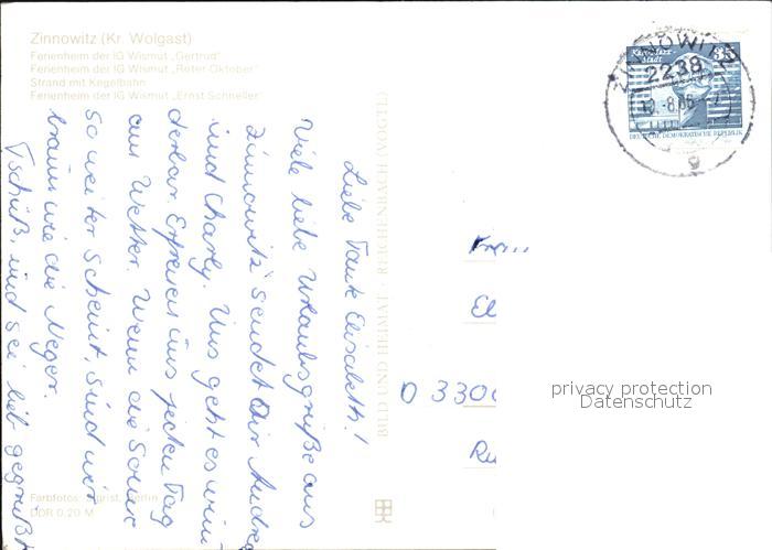 72412989 alte Postkarte Zinnowitz Ostseebad Ferienheime IG Wismut Gertrud Roter Oktober Strand Kegelbahn postalisch gelaufen Erhaltung siehe scans KatCode: 11110013059107