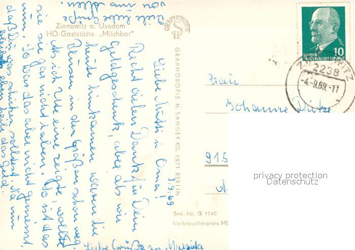 73682079 alte Postkarte Zinnowitz Ostseebad HO Gaststaette Milchbar postalisch gelaufen Erhaltung siehe scans [FriedD77] KatCode: 11110013059107
