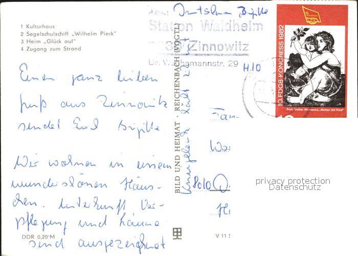 72401719 alte Postkarte Zinnowitz Ostseebad Kulturhaus Segelschulschiff Wilhelm Pieck Heim Glueck auf Strandzugang postalisch gelaufen Erhaltung siehe scans KatCode: 11110013059107
