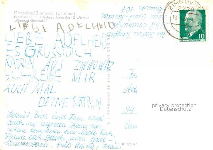 72727465 alte Postkarte Zinnowitz Ostseebad Promenade mit Erholungsheim der IG Wismut Klement Gottwald postalisch gelaufen Erhaltung siehe scans [FriedD77] KatCode: 11110013059107