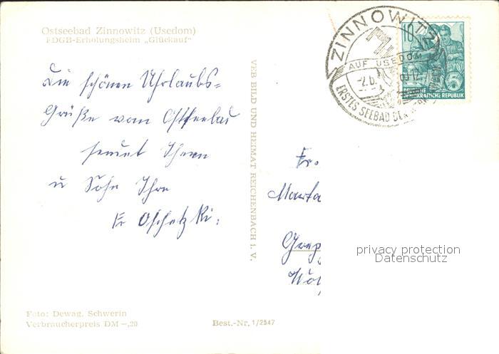 72060685 alte Postkarte Zinnowitz Ostseebad Usedom FDGB Erholungsheim Glueckauf postalisch gelaufen Erhaltung siehe scans KatCode: 11110013059107