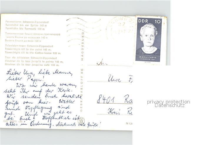 71965862 alte Postkarte Zippendorf Fernsehturm postalisch gelaufen Erhaltung siehe scans KatCode: 11110013004000
