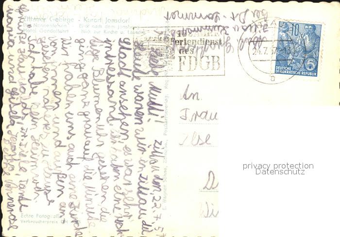 72407090 alte Postkarte Zittau Kurort Jonsdorf die Nonnenfelsen Hotel Gondelfahrt Kirche Lausche Jonsberg postalisch gelaufen Erhaltung siehe scans KatCode: 11110014286470