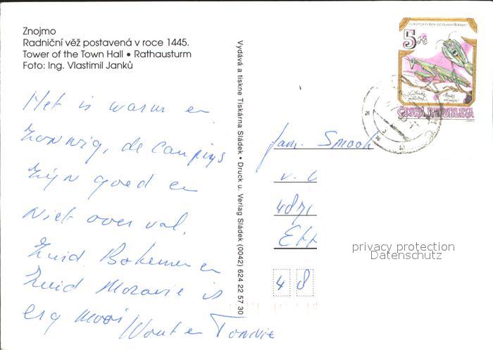 old postcard Znojmo Rathausturm 1938 und 1617 postalisch gelaufen Erhaltung siehe scans