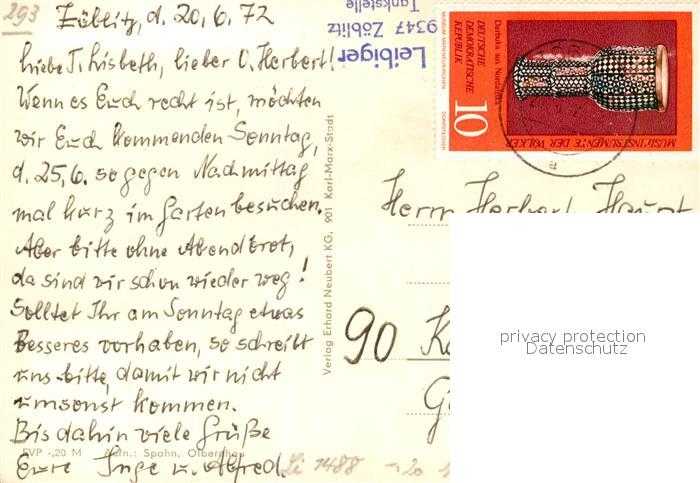 73107949 alte Postkarte Zoeblitz Sachsen Am Marktplatz Hotel Kniebreche Teilansicht Schulstrasse Wilhelm Pieck Strasse postalisch gelaufen Erhaltung siehe scans [WerneD78] KatCode: 11110014181410