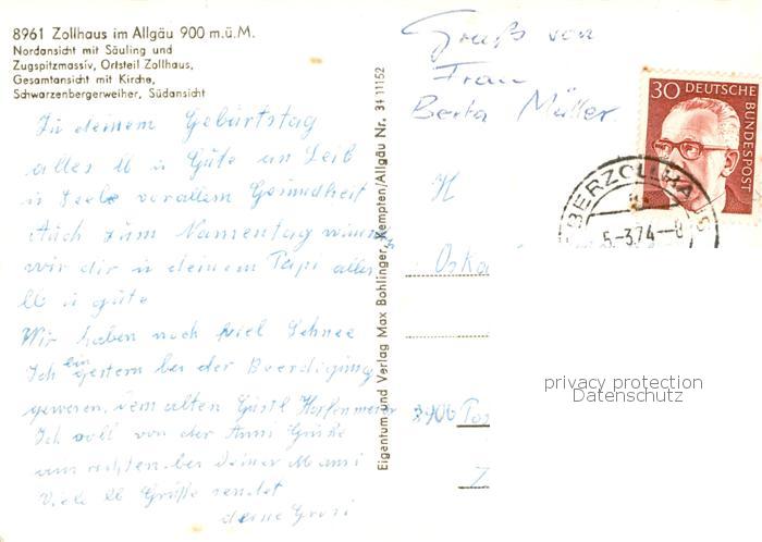 74052367 alte Postkarte Zollhaus Allgaeu Pfronten Ansicht mit Saeuling Zugspitzmassiv OT Zollhaus Kirche Schwarzenbergweiher postalisch gelaufen Erhaltung siehe scans [WerneD78] KatCode: 11110009777159