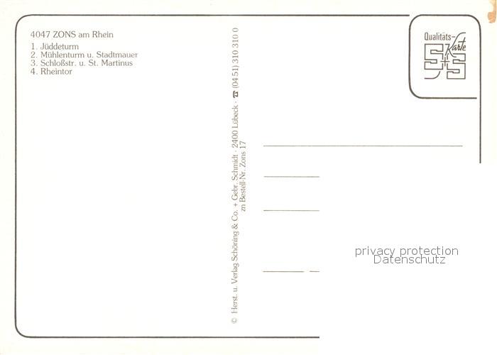 73181496 Zons Rhein NRW Jueddeturm Muehlenturm und Stadtmauer Schloss Str und St Martinus Rheintor postalisch nicht gelaufen Erhaltung siehe scans [WerneD78] KatCode: 11110005162004