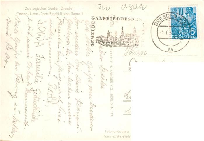 alte Postkarte Zoo Gardin Zoologique– Dresden Orang-Utan Buschi Suma postalisch gelaufen Erhaltung siehe scans [IrynaD87]