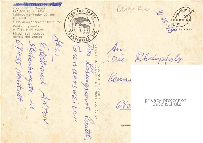 74150551 alte Postkarte Zoo Gardin Zoologique– Frankfurt Main Schimpansen Kinder Mahlzeit postalisch gelaufen Erhaltung siehe scans [IrynaD87] KatCode: 22540000004400