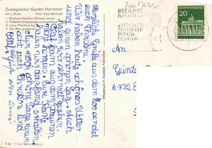 74034731 alte Postkarte Zoo Gardin Zoologique– Hannover Nashorn Loewe Yak Flusspferd postalisch gelaufen Erhaltung siehe scans [IrynaD87] KatCode: 22540000004400