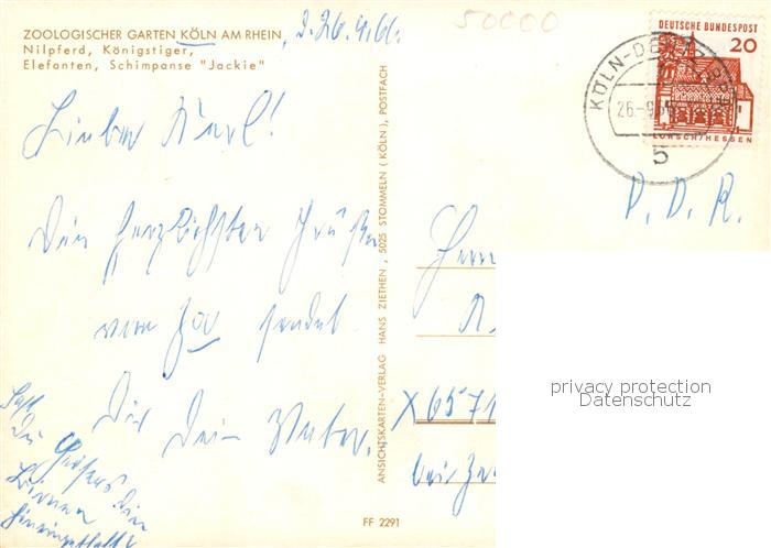 73901281 alte Postkarte Zoo Gardin Zoologique– Koelner Zoo Nielpferd Affe Elefanten postalisch gelaufen Erhaltung siehe scans [IrynaD87] KatCode: 22540000004400