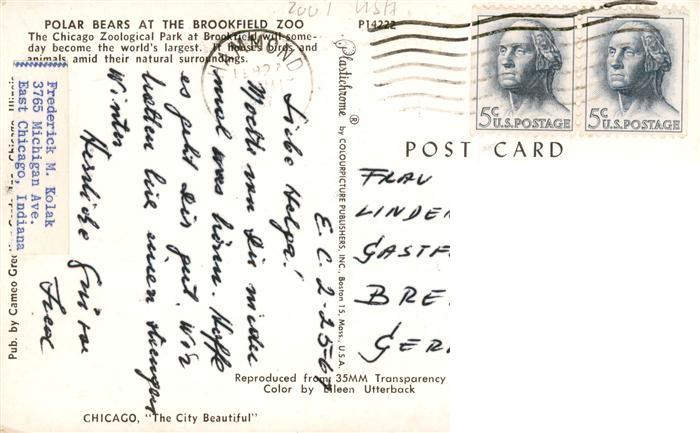 73937144 alte Postkarte Zoo Gardin Zoologique– The Beggars polar Bears at the Brookfield Chicago postalisch gelaufen Erhaltung siehe scans [IrynaD87] KatCode: 22540000004400