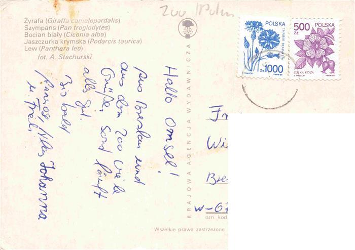 74036096 alte Postkarte Zoo Gardin Zoologique– Wroclaw Zyrafa Bocian Lew Loewe Affe Giraffe postalisch gelaufen Erhaltung siehe scans [IrynaD87] KatCode: 22540000004400