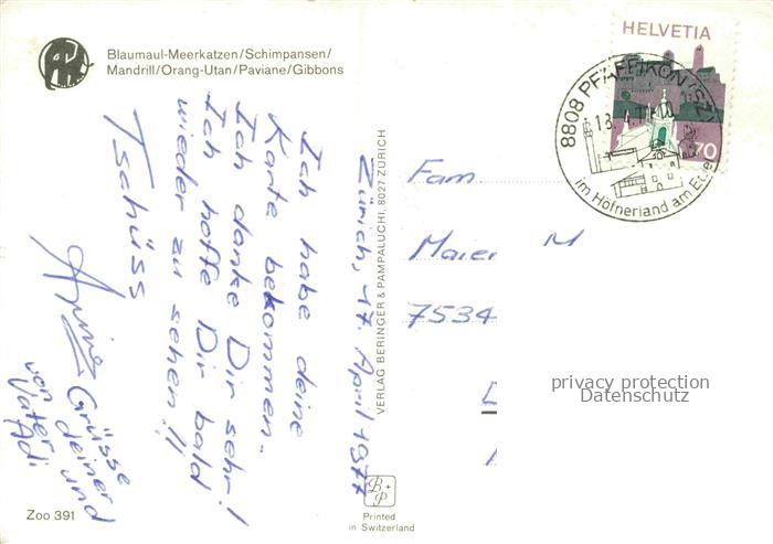 74137916 alte Postkarte Zoo Gardin Zoologique– Zuerich Affen Blaumaul Meerkatzen Schimpansen Mandrill Paviane postalisch gelaufen Erhaltung siehe scans [SanaeD93] KatCode: 22540000004400