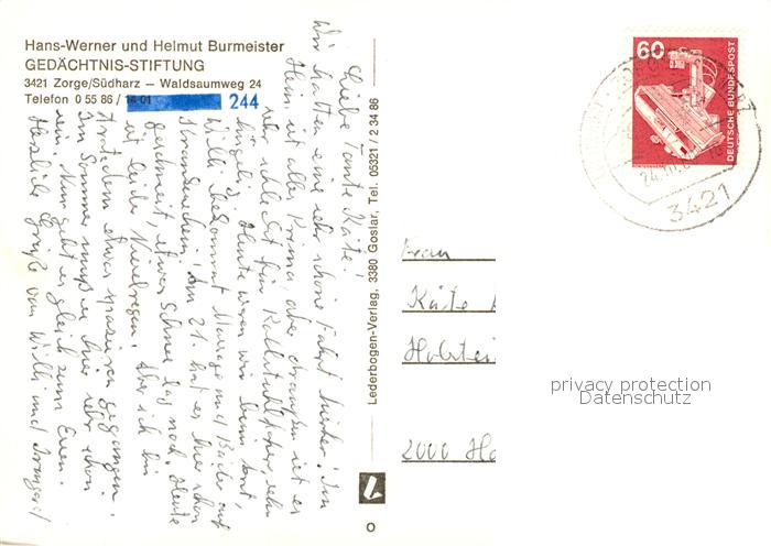 73133551 alte Postkarte Zorge Gurmeister-Gedaechtnisstiftung postalisch gelaufen Erhaltung siehe scans [NatalD47] KatCode: 11110003156016