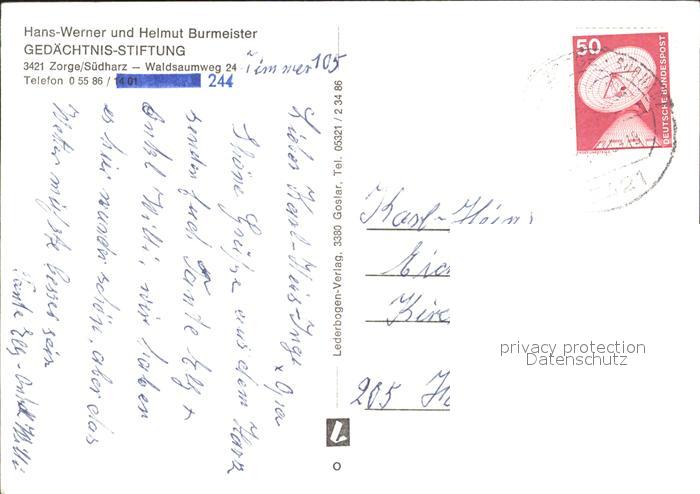 72062320 alte Postkarte Zorge Hans Werner und Helmut Burmeister Gedaechtnisstiftung postalisch gelaufen Erhaltung siehe scans KatCode: 11110003156016
