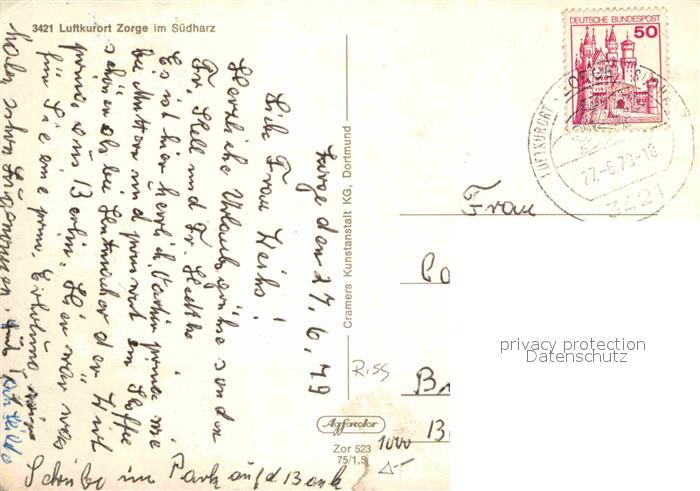 72904682 alte Postkarte Zorge Teilansicht postalisch gelaufen Erhaltung siehe scans [AndreD76] KatCode: 11110003156016