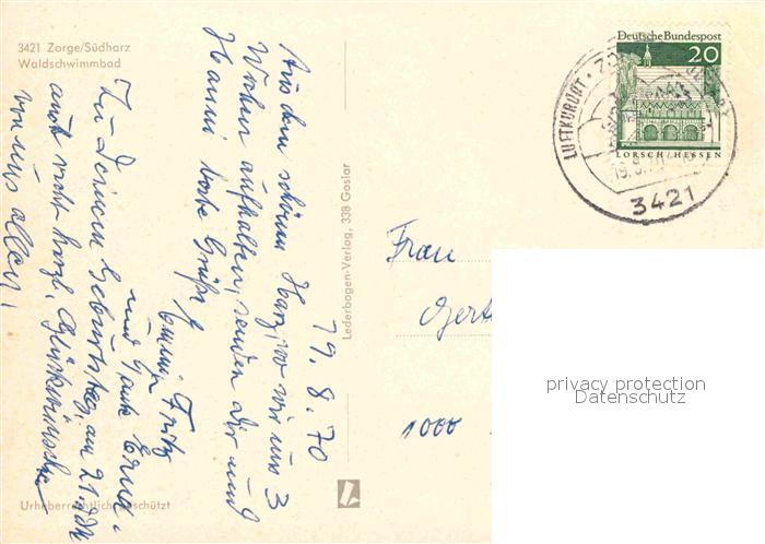 72904775 alte Postkarte Zorge Waldschwimmbad postalisch gelaufen Erhaltung siehe scans [AndreD76] KatCode: 11110003156016