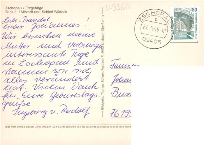 73948049 alte Postkarte Zschopau Blick auf Altstadt und Schloss Wildeck postalisch gelaufen Erhaltung siehe scans [WerneD78] KatCode: 11110014181420