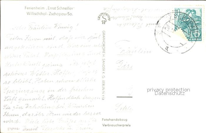 72007116 alte Postkarte Zschopau Willischthal Ferienheim Ernst Schneller postalisch gelaufen Erhaltung siehe scans KatCode: 11110014181420