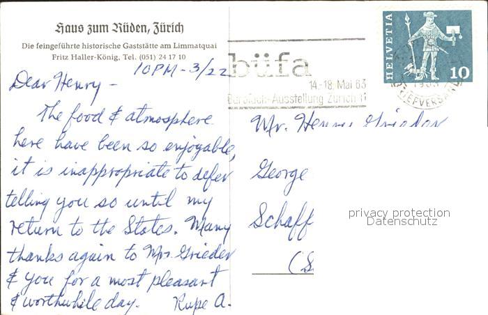 12007774 alte Postkarte Zuerich Haus zum Rueden Restaurant Historische Gaststaette postalisch gelaufen Erhaltung siehe scans KatCode: 11470260925666