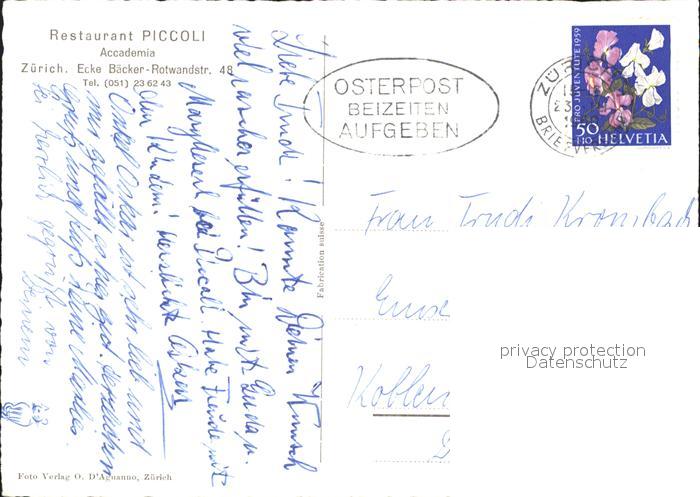 11657953 alte Postkarte Zuerich Restaurant Piccoli Accademia postalisch gelaufen Erhaltung siehe scans KatCode: 11470260925666