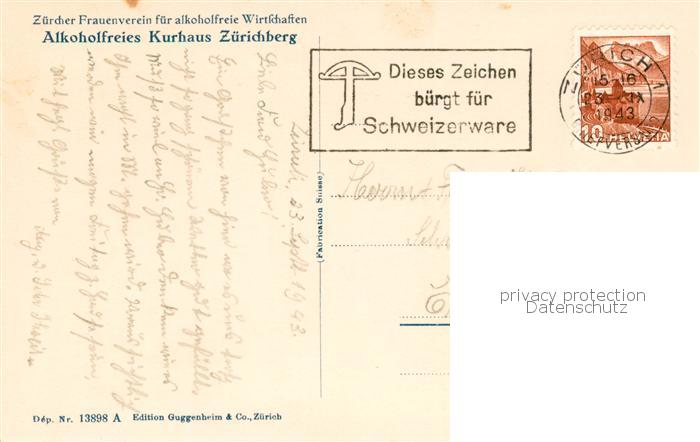 13851377 alte Postkarte Zuerich ZH Alkoholfreies Kurhaus Zuerichberg postalisch gelaufen Erhaltung siehe scans [FriedD77] KatCode: 11470260925666