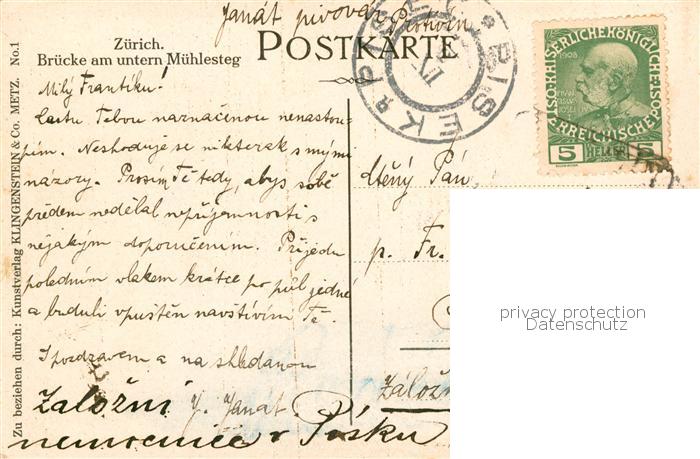 13851374 alte Postkarte Zuerich ZH Bruecke am untern Muehlesteg Kuenstlerkarte postalisch gelaufen Erhaltung siehe scans [FriedD77] KatCode: 11470260925666