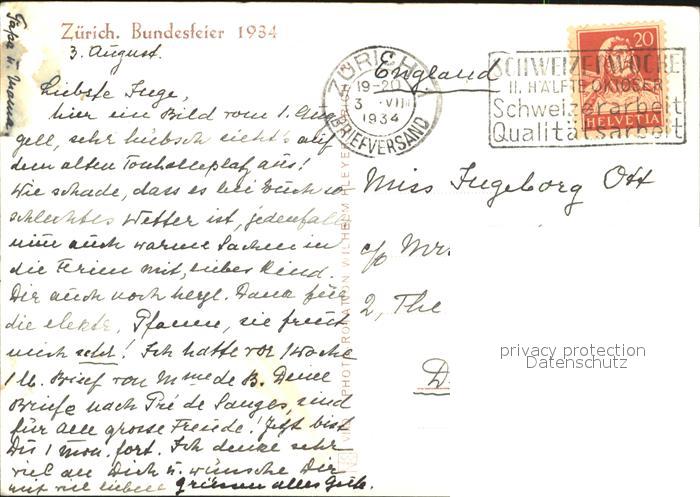 32573021 alte Postkarte Zuerich ZH Bundesfeier 1934 postalisch gelaufen Erhaltung siehe scans [WerneD78] KatCode: 11470260925666