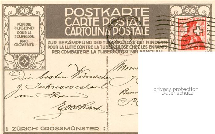 13799906 alte Postkarte Zuerich ZH Grossmuenster Schlatter Kuenstlerkarte Postkarte Fuer die Jugend zur Bekaempfung der Tuberkulose bei Kindern postalisch gelaufen Erhaltung siehe scans [FriedD77] KatCode: 11470260925666
