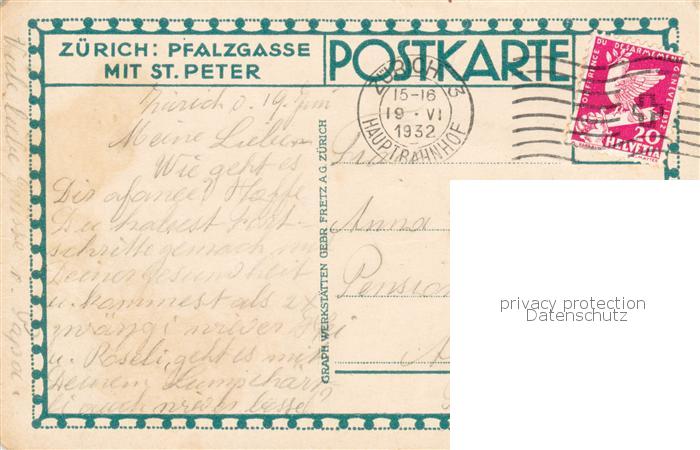13850789 alte Postkarte Zuerich ZH Pfalzgasse mit St. Peter Kirche Kuenstlerkarte postalisch gelaufen Erhaltung siehe scans [FriedD77] KatCode: 11470260925666