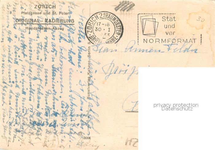 13783687 alte Postkarte Zuerich ZH Pfalzgasse u. St. Peter Kuenstlerkarte-Radierung postalisch gelaufen Erhaltung siehe scans [LiesaD40] KatCode: 11470260925666