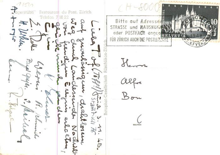 13872582 alte Postkarte Zuerich ZH Restaurant du Pont Jaegerstuebli postalisch gelaufen Erhaltung siehe scans [WerneD78] KatCode: 11470260925666