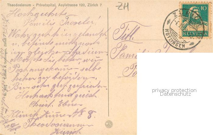 13774427 alte Postkarte Zuerich ZH Theodosianum Privatspital Parkseite Sanatorium Kuenstlerkarte postalisch gelaufen Erhaltung siehe scans [FriedD77] KatCode: 11470260925666