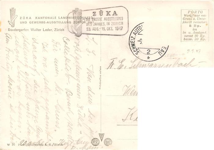 13888567 alte Postkarte Zuerich ZH ZueKA Kantonale Landwirtschafts und Gewerbeausstellung Zuerich 1947 Sondergarten Walter Leder postalisch gelaufen Erhaltung siehe scans [WerneD78] KatCode: 11470260925666