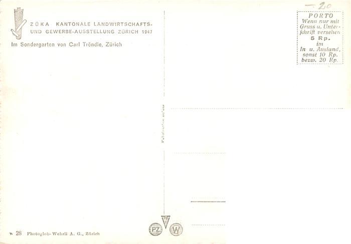 13888569 Zuerich ZH ZueKA Kantonale Landwirtschafts und Gewerbeausstellung Zuerich 1947 Sondergarten von Carl Troendle postalisch nicht gelaufen Erhaltung siehe scans [WerneD78] KatCode: 11470260925666